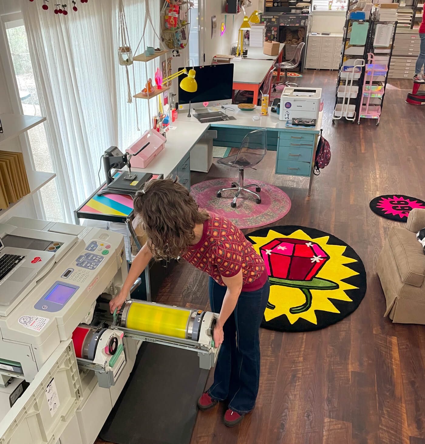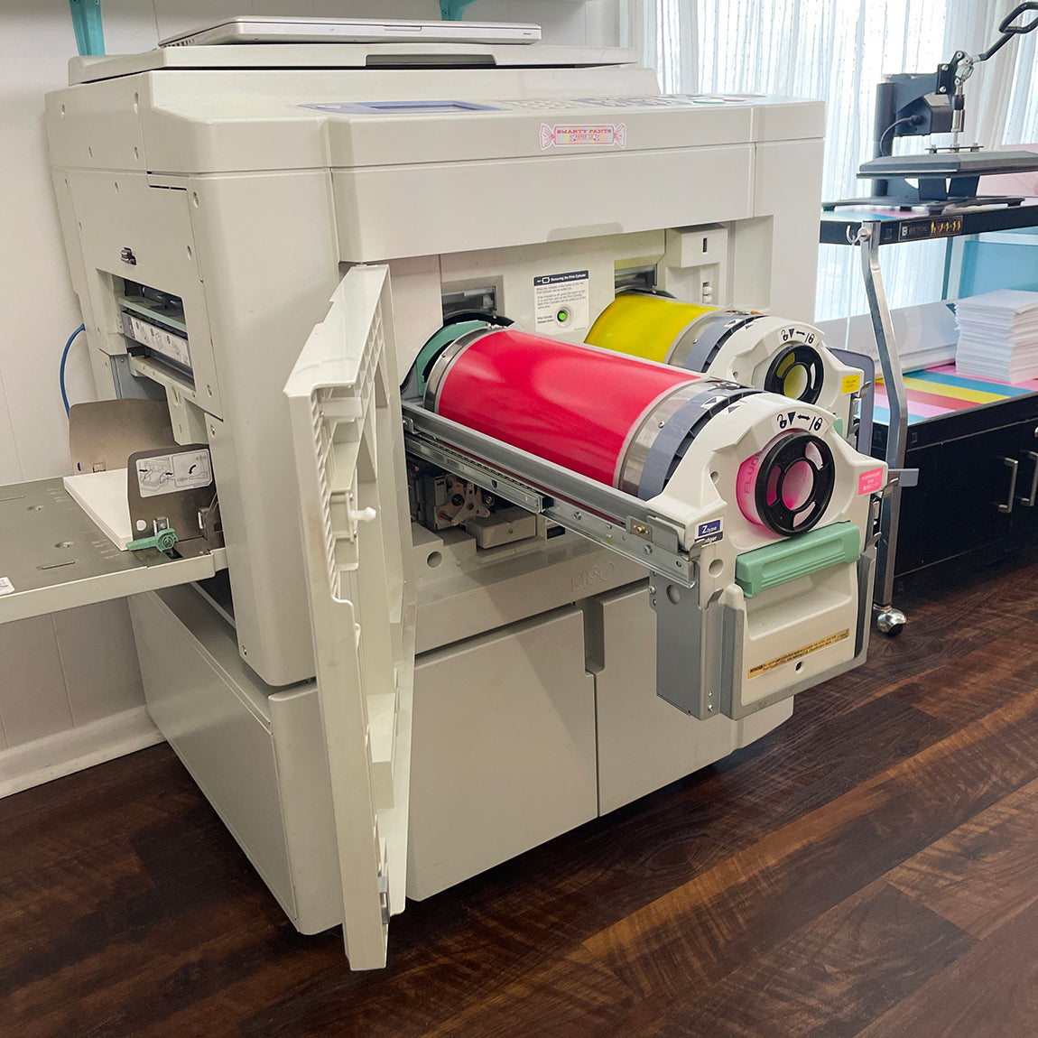 We named her that because half the time, she doesn’t Wanda print anything. But when she does? You’ll catch us happy dancing to her weird thumpy beat in the studio. Like all Risos, Wanda prints one color at a time, so the process is very hands-on and somewhat unpredictable. No two prints are 100% alike, which is just as well, because we love Wanda, quirks and all.